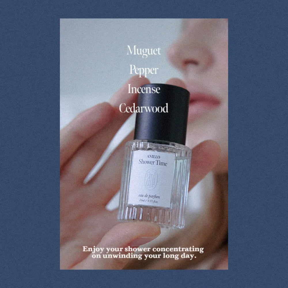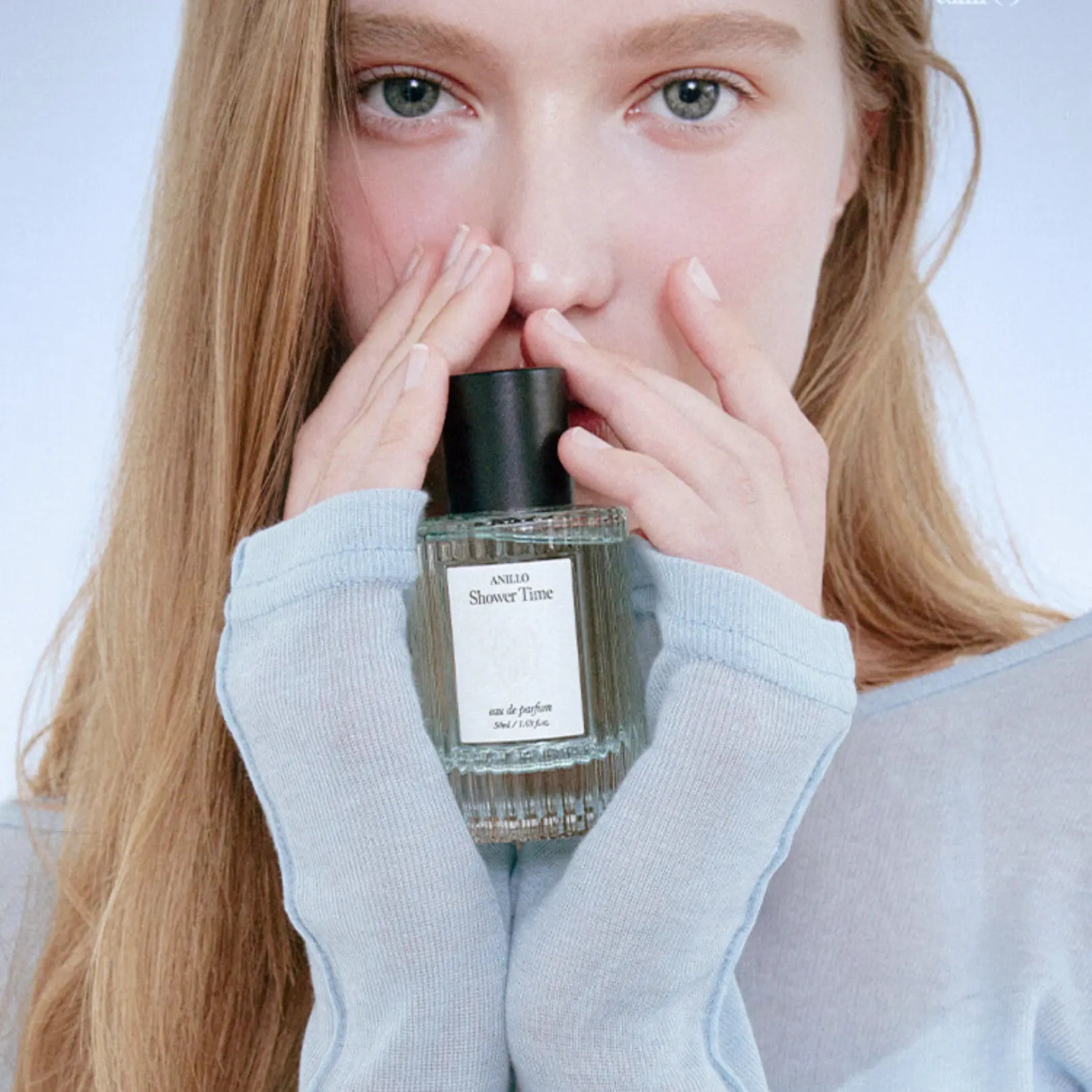 anillO’s Shower Time Eau De Parfum opens with fresh aqua fragrance, settling into spices and warm woods for a revitalising ritual.