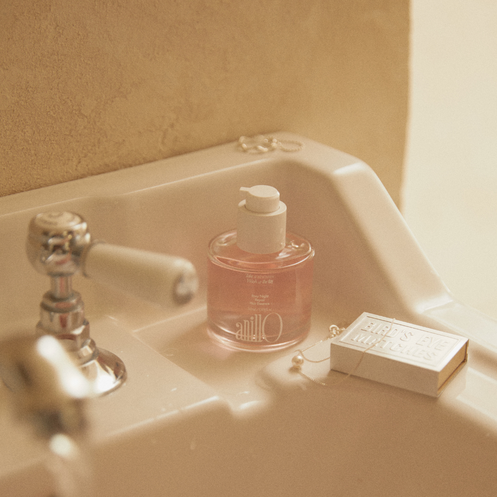 anillO’s Rosy Night Repair Hair Essence provides deep moisture to dry, damaged hair while smoothing out frizz for a glossy finish.