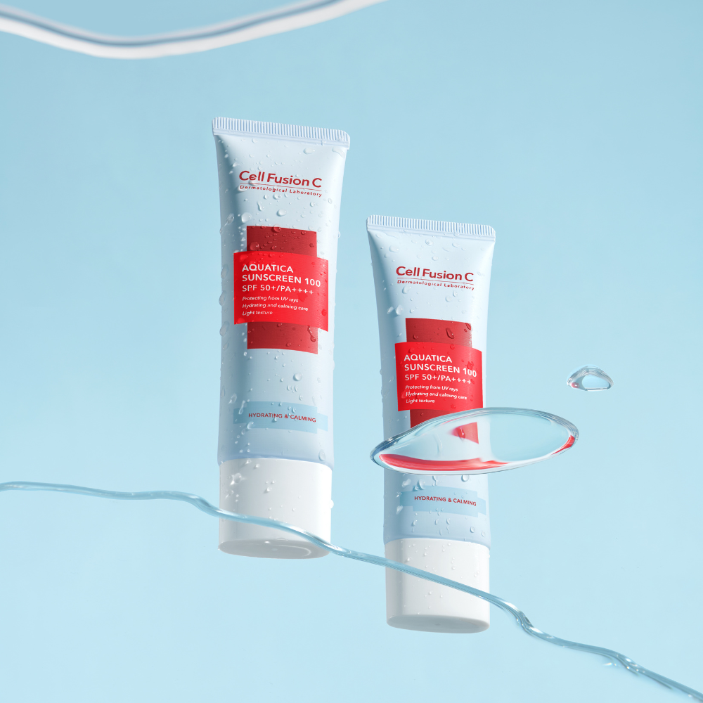 Cell Fusion C's Aquatica Sunscreen 100 is a lightweight, hydrating sun essence that soothes and protects your skin, keeping it dewy and refreshed all day!