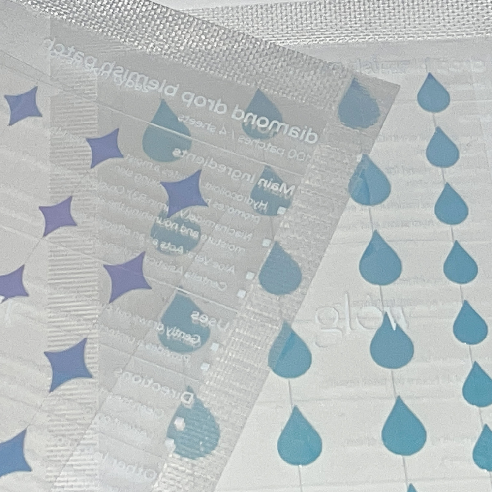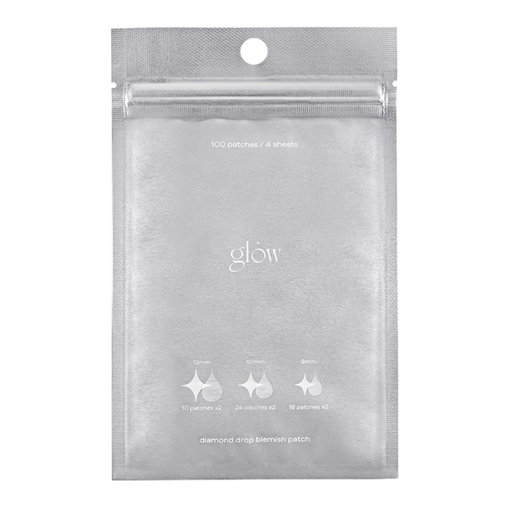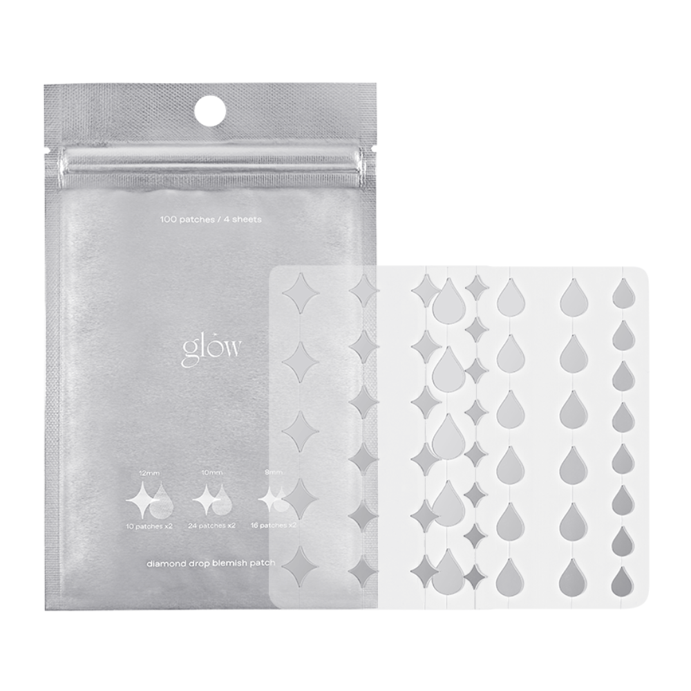 glow’s diamond drop blemish patches are holographic hydrocolloid spot patches, stylishly shaped like teardrops and diamonds, designed to cover and protect pesky pimples.