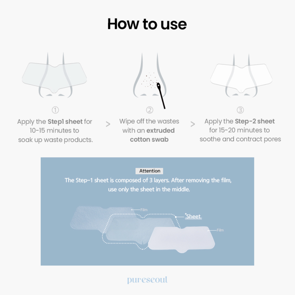 This expert nose pack features two patches: Step 1 gently melts away excess sebum and blackheads deep within your pores, while Step 2 soothes your skin after cleansing. Formulated with a pore-care blend, it combines sebum-absorbing ingredients like exfoliating witch hazel and ivy extracts to remove dead skin, with calming antioxidants such as green tea, panthenol, and purslane to protect your skin and close up enlarged pores.