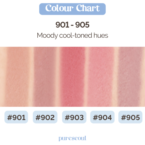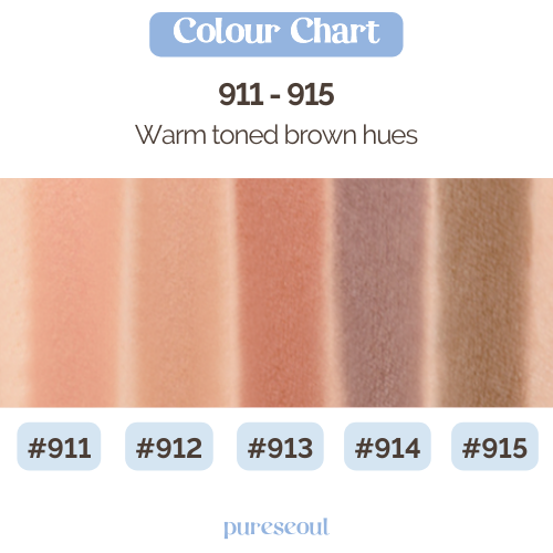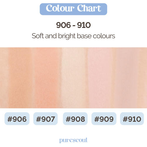 - #906 - #910: Soft and bright hues that work well as a clean base shade - suit both warm and cool toned