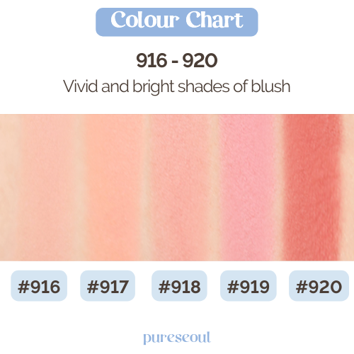 - #916 - #920: Vibrant, high-saturation shades of blush to add a playful element to your look.